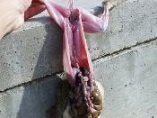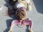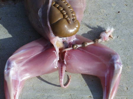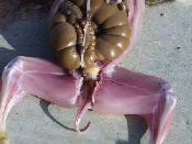 Note the lower intestine tract laying over the intestines and the yellow sack of urine.