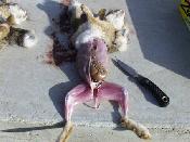 Begin by skinning the Rabbit, starting from the back feet, carefully pull the skin off the Rabbit towards the head. It's like peeling a sock off your foot. Remove tail and any other fur that was left over after the "peel".