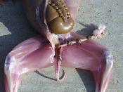 Again, carefully cut around this portion to separate it from the flesh between the legs. Holding the end hole closed with your thumb and forefinger, pull the tract out and place up along the side out of the way. It will still be attached to the intestines, but can be pulled out far enough to be completely out of the way.
