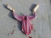 Once the fur is peeled up to the shoulder or head area, make a slit along the stomach to the base of the sternum. Be very careful not to puncture the intestinal tract, if you do try your best not to get any of the bile on the meat. After making the first slit, carefully cut between the legs, cracking the bone until you get to the extreme lower intestine (basically where the round poop comes out).