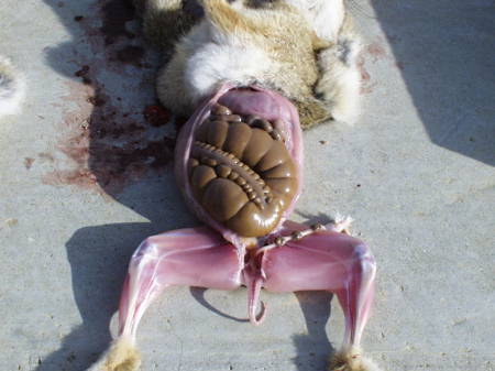 Once the fur is peeled up to the shoulder or head area, make a slit along the stomach to the base of the sternum. Be very careful not to puncture the intestinal tract, if you do try your best not to get any of the bile on the meat. After making the first slit, carefully cut between the legs, cracking the bone until you get to the extreme lower intestine (basically where the round poop comes out).