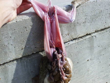 Note the lower intestine tract laying over the intestines and the yellow sack of urine.
